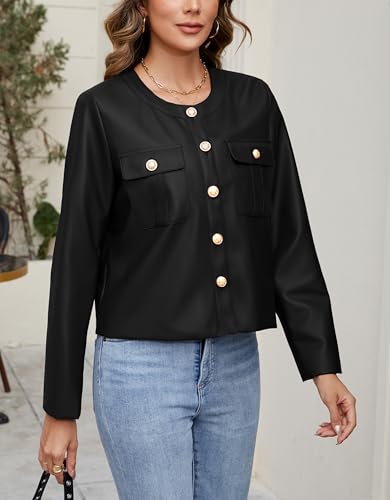 • trendy Design: Leather bomber jacket women features a cropped cut, collarless neckline, long sleeves, button closure, and a loose fit style, this jacket combines casual and edgy styles. The multiple pockets add both functionality and a touch of moto-inspired flair.
