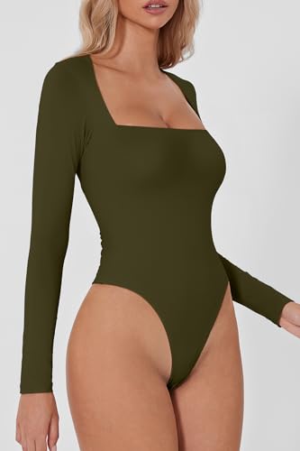 QINSEN Women's Sexy Square Neck Bodysuit Long Sleeve Double Lined Shirt Tops
