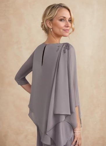 2 Pcs Pant Suits for Women Dressy Elegant Lace Applique Tiered Chiffon 3/4 Sleeve Mother of The Bride Pantsuits for Wedding