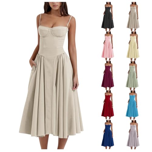trending ! Womens Corset Dress Boho Summer Spaghetti Straps Midi Dress Low Cut Flowy Pleated Bustier Sundress