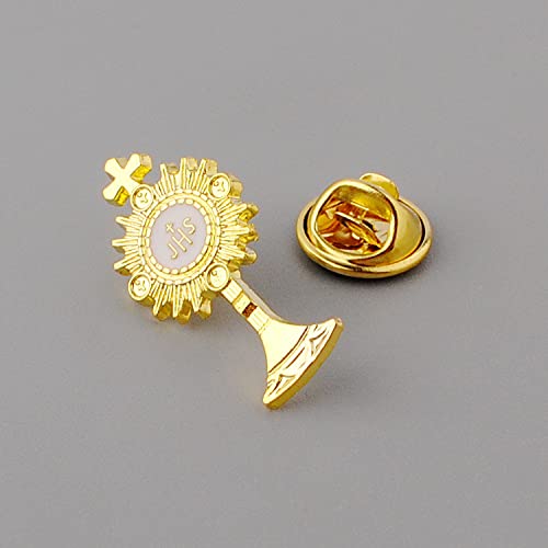 Item width: 0.47 inchesMaterial: ZincMetal type: AlloyClasp type: Clutch BackGem type: NoPREMIUM QUALITY – These stunning chalice lapel pins / tie tacs are in both gold tone. It is sturdy and has a good back clip which made it stay upright the entire day.CLASSIC DESIGN – These pins are versatile and can be used as a lapel pin or tie pin. can be worn on suit lapels, attached to bible bags, or backpacks. Each pin comes with a clutch back and is carded for easy handling.PERFECTLY SIZE – This pin is just the right size. 1 inch and made a nice addition to kid's first communion suit.KEEPSAKE GIFT – These chalice pins will be a piece they will cherish as a reminder of their First Communion, Confirmation or Special Catholic Gift. Great gift for Kids 1st Holy Communion. GREAT catholic keepsake gift for boys and girls.YOU WILL GET – 6 Sets of chalice lapel pins. Nice quality and good cost. Ideal Keepsake Gift for Catholic Youth or Minister Perfect for everyday use. finest materials and excellent craftsmanship ensure long-lasting durability.