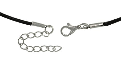 • Black leather cord dimensions: 2.0 mm wide x 18 inches long with a 2 inch extension; Clasp: Lobster claw