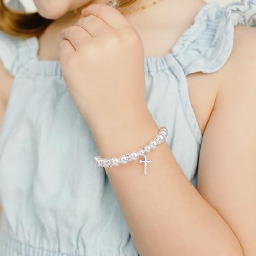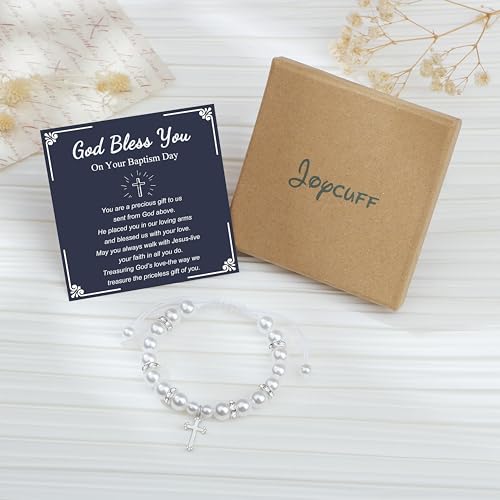Item display length: 3 inchesMaterial: StoneMetal type: Stainless SteelClasp type: SlideChain type: Box ChainGem type: No gemstoneβοΈγBaptism Giftsγ: Congratulations on your baptism. This will be a day you will never forget. This cross bracelet makes a loving baptism gift or first communion gift, and your daughter is going to love this crystal charm bracelet!βοΈγMeaningful Christian Giftsγ: The sparkly & lovely pearls bracelet comes with a fine card and a cute packaging gift box. A perfect gift for goddaughter, granddaughter, daughter and niece on the First Communion, Baptism, Christmas, Confirmation, Easter, or any special moment.βοΈγHigh-Quality Materialγ: The cross bracelet combined white crystals and white pearls, with a stainless steel cross, that very stunning and shining. All materials are nickel free and lead free, which are hypoallergenic and safe for sensitive skin.βοΈγAdjustable Sizeγ: Specially designed. The bracelet comes with a sliding knot that can adjusting from 5 to 10 inches, fit for most wrists. Comfortable to wear, very versatile.βοΈγAfter Sales Serviceγ: We are always committed to providing the highest quality products possible. If you have any questions about the bracelet, please feel free to contact us. Perfect for everyday use. finest materials and excellent craftsmanship ensure long-lasting durability.