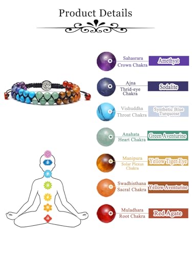 Material: CrystalMetal type: AlloyClasp type: Lobster ClawChain type: Braided ChainGem type: Chakra crystalChakra Bracelet: Double braided 7 chakra crystals bracelet with a small life tree charm, reiki healing crystal gemstone bracelets jewelry for womens. Fashion design also can get positive energy from the chakra gemstones.Chakra Bracelet Material: 7 Chakra Bead:Amethyst, Sodalite, Synthetic Blue Turquoise, Green Aventurine, Tiger Eye, Yellow Aventurine, Red Agate.Size: Length:6.5-10.5(adjustable size, suitable for wrist about 6-8 inches), Chakra Bead:6mm, Life Tree Charm:9.5mmChakra Energy: The chakras are the centers of energy, located on the midline of the body. Each of the 7 chakras represents a physical, emotional or mental state, helping to enrich one's spirit and well-being The chakra stones are used to balance the chakras on a daily basis and to enhance chakra healing.ideal Gift: Come with a velet pouch, ready for gift. It's great crystal bracelet gift for Birthday, Anniversary, Thanksgiving, Christmas. This gold bangle bracelet is suitable for all occasions. Perfect for everyday use. finest materials and excellent craftsmanship ensure long-lasting durability.