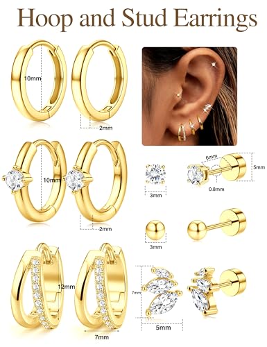 Material: Stainless SteelMetal type: Stainless SteelBack Finding: Flat BackGem type: Cubic Zirconia【Earring Sets for Multiple Piercings】: Dainty cartilage earring set comes in 6 different styles, including 3 pairs of flat back earrings and 3 pairs of huggie hoop earrings. It can be worn alone, folded, or paired with other earrings to meet your various look needs and give you a fresh look every day. A must-have collection for women who love to mix and match their earrings.【Gold Hypoallergenic Earrings】: Flat back gold earrings are made of high-quality 316L surgical stainless steel and are suitable for sensitive ears. They are hypoallergenic, non irritating, nickel free, and lead-free. Upgraded vacuum plated 14K gold process provides long-lasting color retention, and the highly polished surface makes the gold plated earrings super smooth and shiny.【Huggies Hoop and Stud Earrings Set】: Nap earrings Gauge: 20G=0.8mm, small huggie earrings: 10mm, thick hoop: 12mm. soft flat back earrings, remove the pain and hassle of traditional earrings, won't poke skin or hook hair, you won't feel discomfort even when sleeping or sporting. The hoop earring clasp is well made, easy to open and close, and will not slip off.【Gold Piercing Earrings Set】: Our waterproof gold earrings set can be used as helix piercing jewelry, cartilage earrings for women, tragus earrings, conch piercing jewelry, earlobe stud earrings, nap earring studs, sleeper earrings, starter earrings, small earrings for second hole and more.【Perfect Gift For Women】: The gold hoop earring set comes with exquisite jewelry box packaging, making it the perfect gift for birthdays, graduation ceremonies, Christmas, birthdays, Mother's Day, Valentine's Day, New Year, parties, and other occasions. Whether it's a formal or casual occasion, these earrings will bring her confidence and radiance. Perfect for everyday use. excellent materials and excellent craftsmanship ensure long-lasting durability.