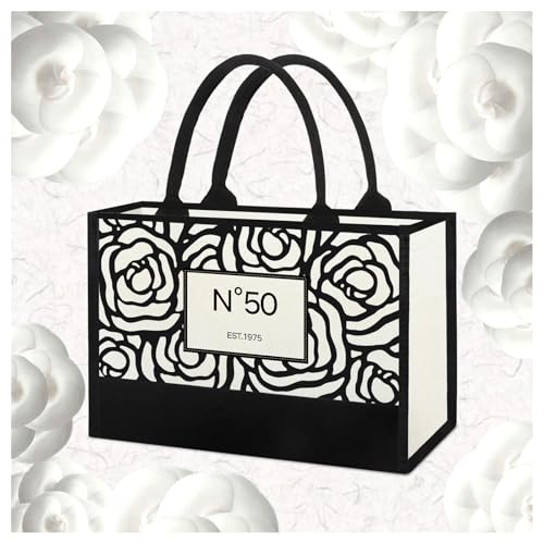 Fabric type: CanvasCare instructions: Wipe with Damp ClothOrigin: Imported【Elegant 50th Birthday Gifts for Women】It features a classic camellia pattern outlined by black and white lines. The front is sewn with the logo N°50 EST 1975conveying a specific meaning. This design is a continuation of the classic style. It celebrates the 50th birthday in an elegant and charming manner.【exceptional 50 Years Old Gifts for Her】Inspired by classic brand, we combined the elements of camellia flowers with the N°number, and incorporated them into this practical canvas tote bag. We hope that every 50-year-old woman can smile like a flower on her birthday and be elegant and composed every day in the future.【50th Birthday Tote Bag Present】This bag is made of 100% durable pure cotton canvas fabric, with reinforced stitching and a sturdy handle, ensuring reliable daily carrying. Fashion-forward design with classic silhouette, suitable for both casual and professional settings.【Happy 50s Birthday Decorations for Women】This unique 50th birthday gifts for women is a perfect gift idea for your mom, wife, sister, aunt, friends, daughter, female coworkers on their 50th birthday. Spacious tote bag perfect for daily use, shopping, travel, beach, picnic, party, office work, gym, etc.【Great 50th Birthday Gift Ideas】100% satisfactory service is the most important aspect of our work. We are confident that you will be completely satisfied with our products. If you have any reason to return them, please contact us first. We offer 100% satisfactory after-sales service. Perfect for everyday use. finest materials and excellent craftsmanship ensure long-lasting durability.