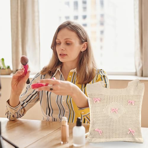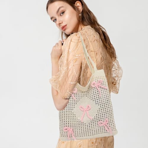Cute Beach Bag, Mesh Knitted Bow Tote Bag, Bohemian Style, Sweet and Cute, Large Capacity, Suitable for Girls and Ladies Summer Beach Vacation