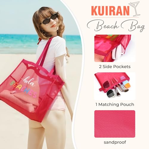 trending ! 30L Large Beach Bag with Pouch Foldable Sandproof Lightweight Pool Mesh Tote Bag with Two Pockets for Swimming Travel