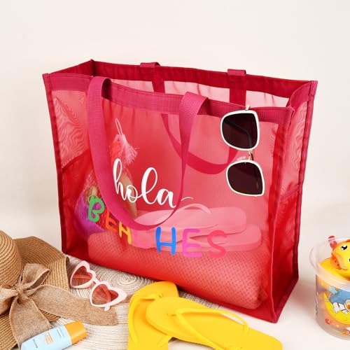 • 30L Large Mesh Beach Bag with Special "Hola Beaches" Print – Spacious beach tote bag featuring a vibrant "Hola Beaches" graphic. This large mesh beach bag provides ample room for carrying beach towels, sunscreen, and snacks on your next beach trip. Dimensions: 18.9"(L) x 6.5"(W) x 15.7"(H)