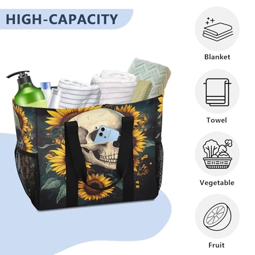 Large Waterproof Travel Tote Bag for Women Men, Floral Sunflower Skull Canvas Beach Bag with Lining & Pockets - Reusable Grocery/Laundry/Kitchen/Pool/Picnic Tote (15.4x9.8x12.8in)