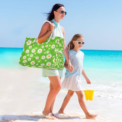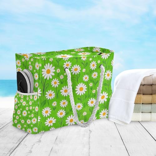 Lovely Daisy Floral Green White Sandproof Beach Bags Sandproof with side pocketes Sport Weekender Travel Essentials Beach Birthday for Women