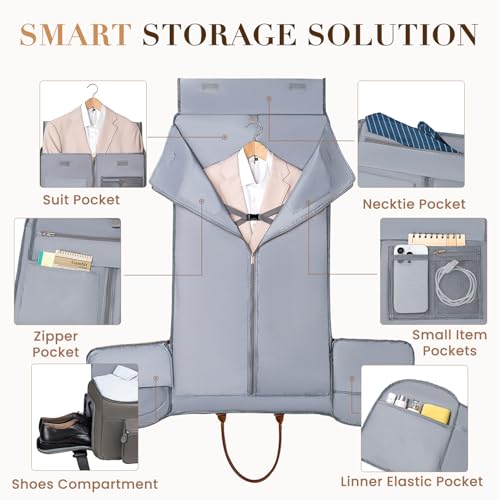 Color: GreyMaterial: LeatherBrand: VessgraClosure Type: Zipper【Large Capacity Garment Bag】 Measuring 22.8 L x 12.6'' W x 12.4'' H, with 14 different compartments, our large capacity garment bag makes organizing all your travel essentials a breeze. It is designed to hold suits, dresses, shoes, ties, passports, and everything you need to look your best on the go.【Superior Durability】 Crafted with premium PU leather materials, our garment bag is waterproof, tear-resistant, and built to withstand the wear and tear of travel. The metal zipper is more durable than standard garment duffel bag zippers, and the handles are rivet-reinforced to accommodate heavier loads.【2 in 1 Convertible Garment Bag】 Our travel garment bag effortlessly transforms from a garment bag to a travel duffel bag, and features multi convenient carrying options including short loop handles, detachable shoulder strap, and back sleeves to attach to a suitcase handle to free up your hands.【Keep Clothes Without Wrinkles】 Our garment bag's exceptional design includes a fixed hanger, elastic band with buckle, and fixing buckle to keep your clothing in place, ensuring that your garments remain wrinkle-free throughout your travels. Making it the perfect companion for business trips, weekend getaways, and formal events.【Humanity Design】 Our garment bag is designed to be as convenient as it is functional, featuring a monolithic construction design with only one zipper to close the bag. The fully enclosed design keeps your belongings safe and the separate shoe compartment ensures that your clothes stay clean. Perfect for everyday use. finest materials and excellent craftsmanship ensure long-lasting durability.