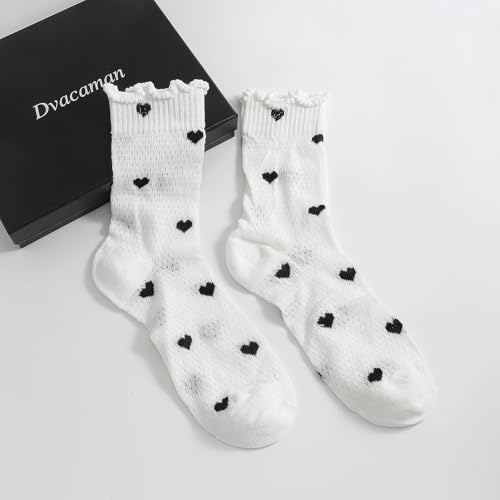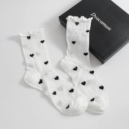 • Women's Lace Heart Mesh Socks, Ruffle Top Mid-Calf Summer Sock, Breathable Cute treasure Pattern Crew Socks for Casual Outfits