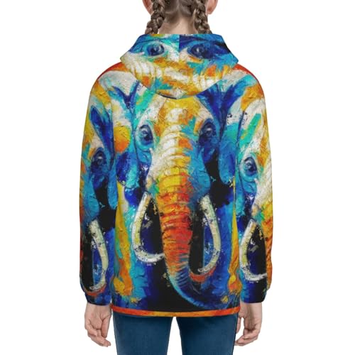 Oil Painting Elephant Kids Pullover Hoodies Boys Zip Up Sweatshirts Girls Athletic Clothes with Pocket