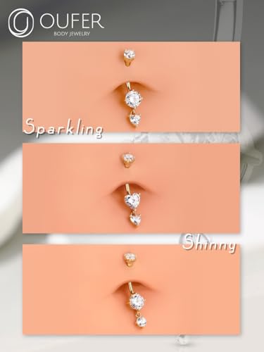 trending ! OUFER Belly Button Rings, 14K Solid Gold Belly Rings, Dangle Belly Button Piercing, 14G Belly Piercing Jewelry, Clear CZ Navel Rings, Heart Belly Rings for Women Men