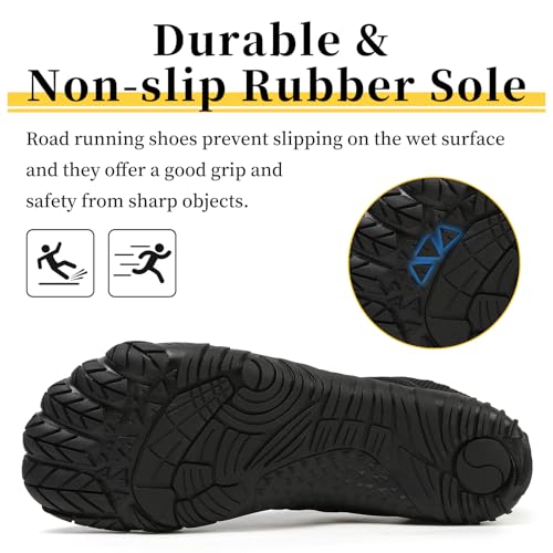 Sole material: RubberOuter material: RubberClosure type: Lace-UpWide Toe Box: Barefoot shoes compared to the toe of traditional running shoes, have a wider toe design and offer more spacious room, allowing toes and the soles of the feet to have greater extension and mobility ,so the toes will not be deformed due to compression.ZERO-Drop: These barefoot running shoes feature a zero-drop and non-slip sole design, keep your feet close to the ground and balanced, non-elevated sole place the forefoot and heel flat on the ground to allows the feet , putting the feet in a neutral position and naturally adjusting the posture of the feet, back and body posture. Zero drop shoes will give you a natural feel,disperse impact better and reduce injuries.Arch Support:Barefoot shoes for women have removable insoles that help support the arches without putting too much pressure on the soles of the feet. The smooth and bendable workout shoes are built stronger to provide greater torsional rigidity, meaning a shoe is less likely to give when a severe twisting force is applied.ANTI-SLIP OUTSOLE: The anti-slip rubber sole, with an ergonomically molded, shock absorption performance cushioning separated protective toe guard.Excellent workmanship to prevent the seams around the toes fray and split within a short time.Multiple Occasions: Our men's cross-trainer shoes are perfect for indoor and outdoor activities, such as gym workout, running, walking, cross training, hiking, weightlifting, wrestling, trail running, beach, squats, fishing, boating, jogging, camping, etc. Perfect for everyday use. finest materials and excellent craftsmanship ensure long-lasting durability.