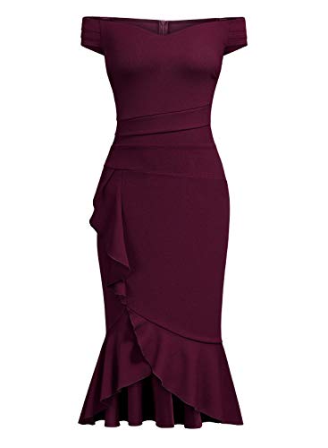 trending ! Knitee Women's Off Shoulder V-Neck Ruffle Pleat Waist Bodycon Evening Cocktail Slit Formal Dress