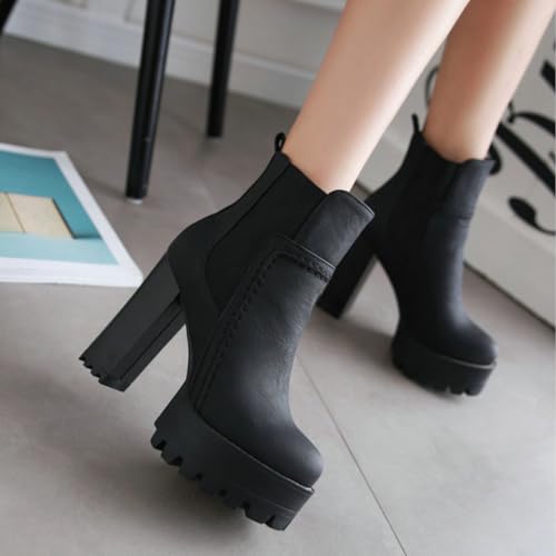 Women's Round Toe Ankle Boots Chunky High Heel Chelsea Style Platform Slip-On Winter Slouch Leather Wide Calf Stretchy Biker Shoes