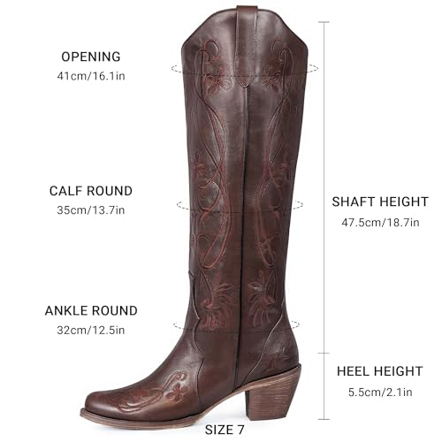 Outer material: Faux LeatherClosure type: Pull-OnTimeless Western Design: Classic cowboy boot silhouette with a high shaft, pointed toe, and chunky heel, embodying rugged elegance and authentic Western charm.Embroidery Detail: Women's cowgirl boots have intricate floral vine embroidery that adds a unique character to the shoe while retaining the traditional features of a tall western boot.Styling Versatility: These women's knee high cowboy boots can be worn with jeans, cowboy hats, dresses, shorts in spring and summer, and sweaters and coats in fall and winter. It's easy to pair with both casual and bold looks.Various Occasions: Whether you're attending a music festival, wedding, theme party, country concert, or just for everyday wear, these floral embroidered western boots are a versatile and contemporary choice with the blend of function and fashion.γHeelchicγ: If you have any questions, please contact us at any time, and we will sincerely provide you with the corresponding reply or solution. Perfect for everyday use. superior materials and excellent craftsmanship ensure long-lasting durability.