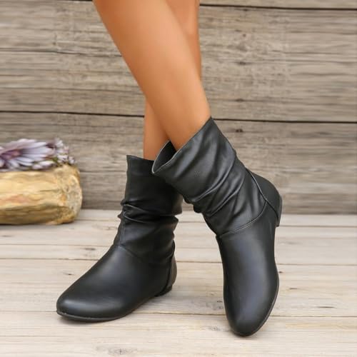 Women's Slouchy Leather Ankle Boots,Fashion Slouchy Ruched Round Toe Slip On Flats Ankle Booties Low Heel Casual pleasant Winter Fall Mid Calf Dress Short Boots With Side Zipper