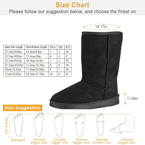 • 【2024 Upgrade Warm & Cozy Boots】: These timeless snow boots are made of polyester and thick plush lining to keep the foot and calf warm in cold weather conditions and offer amazing cozy comfort all-day long, making them perfect for the snowy season. For a better and more pleasant wearing experience, it's recommened to choose a size up.
