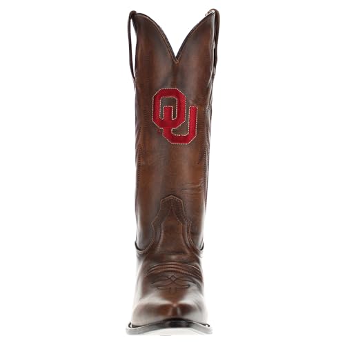 Introducing the Chelsie cowgirl boots- officially licensed for the University of Oklahoma. These stunningly simple antique brown boots are designed to make a statement on game days and in everyday life.Crafted with meticulous attention to detail, these boots offer the perfect blend of fashion and western charm. Made from high-quality materials, these boots are as comfortable as they are fashionable.The cushioned insole provides all-day comfort, ensuring you stay on your feet to celebrate each Sooners victory. Whether you're a student, an alum, or a fan, your school spirit will shine with every step you take. Boomer Sooner!Leather lining and leather outsole. Soles feature heat stamped University of Oklahoma logo. Perfect for everyday use. finest materials and excellent craftsmanship ensure long-lasting durability.