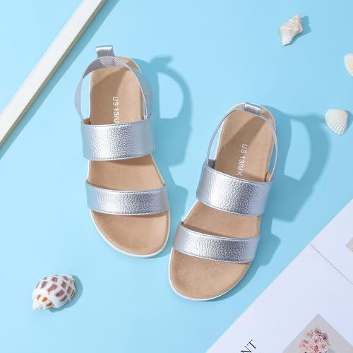 Sole material: RubberOuter material: SiliconeClosure type: Slip OnCOMFOR AND EASY OFF: vintage open toe style girls sandals flat can be worn in water or on land. Great material add comfort and the best touching feeling. Elastic strap closure for easy on and off.SOFT LINING: The microfiber footbed keeps her foot comfortable. Microfiber lining with memory foam, wide enough to fit the chubby feet. These precious sandals for girls are the perfect addition to any outfit your little one is wearing! Girls flat sandals can pair with favorite pants or dress.ANTI-SKID SOLE: The girls platform sandals with rubber sole is flexible, soft and elastic, making walking natural and relax. finest designed, durable sole for long lasting comfort even after a long day on her feet and keep your girls safe. Classic open toe strappy sandals provides a great fit and breathable comfort for hot summer days.PERFECT FOR ALL OCCASION: Ideal for casual walking at park, garden, street, party, school, beach and even in indoor. These classy girls sandals will be your daughters go to for summer footwear.Perfect for little kids girls and big kids girls. Start a fashion trend this season with the sandal! The ideal match for sundresses, skirts and shorts, dressy-casual appeal and allows it to easily be dressed up for the holidays. Perfect for everyday use. High quality materials and excellent craftsmanship ensure long-lasting durability.