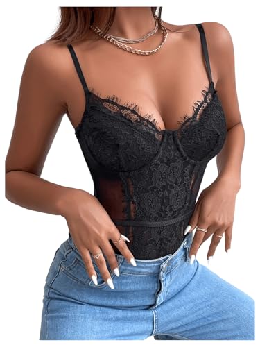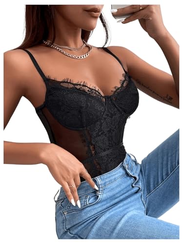 SHENHE Women's Floral Lace Spaghetti Strap Sheer Mesh Sleeveless Cami Bodysuit Tops