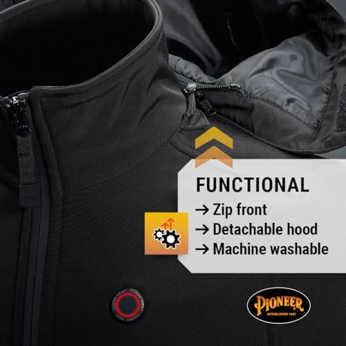 • WOMEN'S HEATED JACKET - Pioneer's Heated Softshell Zip Up Jacket with hood is designed for cold weather conditions and tailored with the woman worker in mind. Made with 4-way stretch material for freedom of movement and mobility