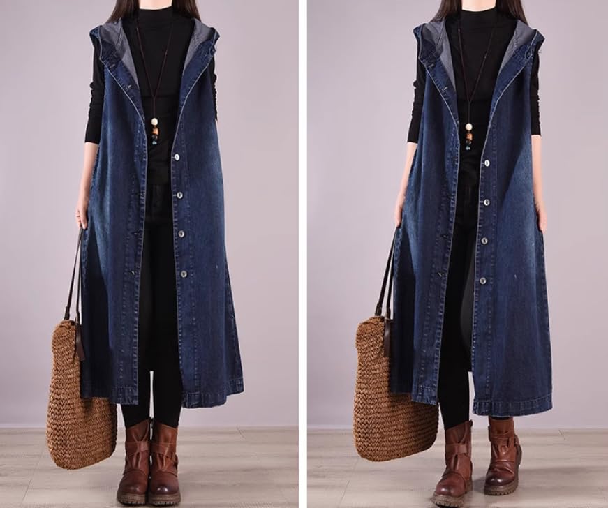 trending ! Long Denim Vest for Women Sleeveless Jeans Jacket Hooded with Pockets Wide Hem Loose Casual