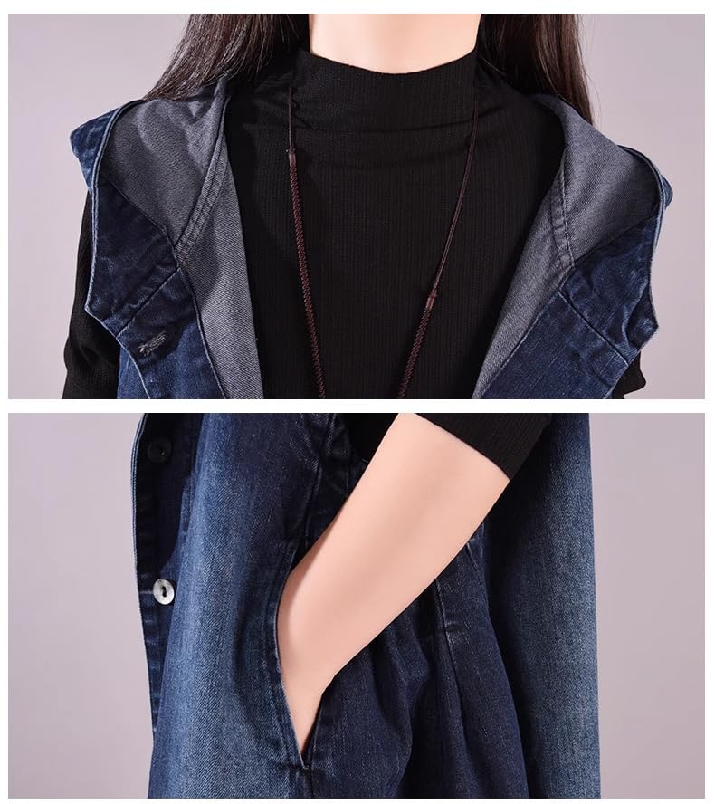 More information about Long Denim Vest for Women Sleeveless Jeans Jacket Hooded with Pockets Wide Hem Loose Casual