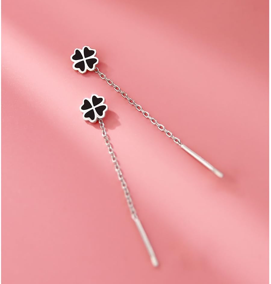 trending ! Reffeer Solid 925 Sterling Silver Leaf Clover Dangle Earrings Chain for Women Teens Girls Black Leaf Tassel Drop Earrings Threader St. Patricks Earrings (A-Silver)