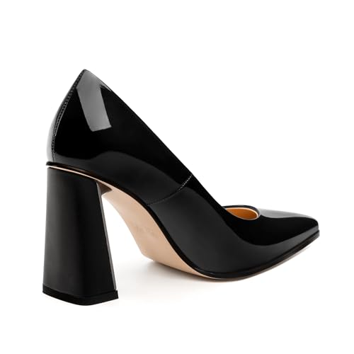 Sole material: RubberOuter material: SyntheticClosure type: Pull-OnClassic Pointed Toe: With a classic pointed toe silhouette, these pumps exude timeless elegance and sophistication. The sleek and streamlined design elongates the appearance of your feet, creating a flattering and feminine look.Chic and Timeless Design: Crafted with a pointed toe and a solid patent finish, these heels exude timeless elegance and chic style. The classic design ensures versatility, allowing you to pair them with a variety of outfits, from dresses to tailored pants, for a polished and put-together look.Easy Slip-On Style: Designed for convenience, these pumps feature a slip-on style that allows for effortless wearing. Simply slide your feet into these shoes, and you're ready to go. This hassle-free design makes them ideal for busy days when you need to quickly put together a chic outfit.Leg-Lengthening Chunky Heel: Boost your confidence with a 3.3-inch chunky heel that not only adds height but also creates a flattering, leg-lengthening effect. Walk with poise and make a statement wherever you go in these fashionable and empowering heels.Pure Material: Our shoes are made of synthetic leather, which will not cause any harm to animals. Due to the different photographic lighting and monitors, there may be a slight color difference between the product image and the real thing. Perfect for everyday use. finest materials and excellent craftsmanship ensure long-lasting durability.