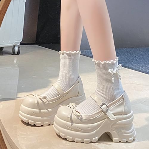 Women's Bow Mary Jane Platform Casual Shoes Comfort Leather Round Toe Ankle Strap Chunky Heel Girls Height Increase School Shoes Grace Non-Slip Nurse Walking Shoes