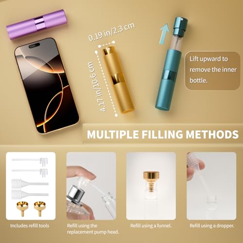 Brand: YIKIBOXColor: Blue+Purple+GoldMaterial: Aluminum, MetalCapacity: 8 MillilitersRecommended Uses For Product: Cleaning Solution, Cologne, Perfume, Water【Compact & TSA-Approved Travel Size】Each refillable perfume bottle holds 8ml and measures only 3.7 x 0.9 inches, making it the perfect size for your purse, pocket, or carry-on. Travel confidently with TSA-compliant, leak-proof perfume atomizers — ideal for vacations, business trips, or everyday carry.【Refillable & Easy to Use】Twist up to reveal the spray nozzle and press to mist — no cap to lose! Simply twist again to close. When refilling, remove the inner glass bottle and use the included funnel, dropper, or perfume pump for a clean and mess-free filling experience.【long-lasting Aluminum Shell & Glass Interior】Made with a robust aluminum exterior and reinforced glass interior, these atomizer bottles are built for long-lasting use. The leak-proof seal ensures your perfume, cologne, or essential oils remain safe, secure, and fresh, even on-the-go.【Versatile & Multi-Purpose】Ideal for perfumes, colognes, aftershave, facial mists, essential oils, or even mouth sprays. The sleek, unisex design makes it a perfect accessory for both men and women, and a thoughtful gift for any occasion, whether it's a birthday, holiday, or special event.【Value Pack with Filling Tools】Comes with blue,purple and gold perfume atomizer bottles, along with 2 sets of essential accessories: funnel, dropper, and pump. These accessories provide convenient, mess-free refilling of different scents, helping to keep things hygienic and organized for everyday use. Multiple refills can be easily done with the included tools. Perfect for everyday use. finest materials and excellent craftsmanship ensure long-lasting durability.