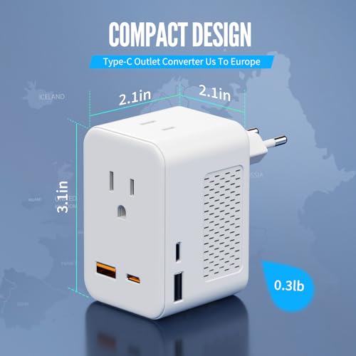 • NEWLY UPGRADED EUROPE TRAVEL CONVERTER: Our European travel voltage converter features technology with a 20W PD automatic charging, providing fast PD charging and standard charging (5V/2.4A) for compatible devices. This compact 6-in-1 power converter adapter combo includes 2 US sockets, 2 USB-A ports, and 2 USB-C ports. Portability for your trip from the U.S. to Europe
