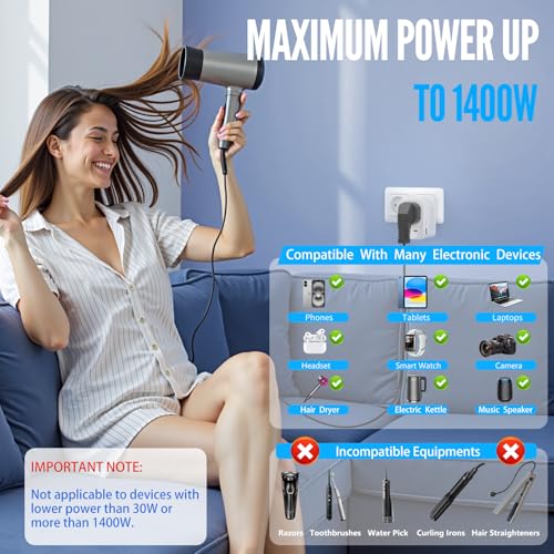 • SAFE AND QUIET FEATURES: Built with advanced safety features, including over-voltage protection, short-circuit prevention, and temperature control, this universal travel adapter ensures safe and reliable operation. The converter for european travel only supports electronic devices rated between 30W and 1400W, please check your device's compatibility before purchasing