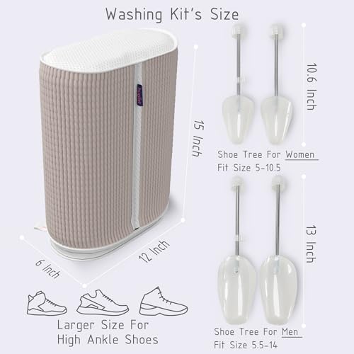 Dual Shoe Bag for Washing with Adjustable Shoe Trees, Laundry Shoe Bag for 2 Shoes, Fluffy Chenille Fiber, Wrap-around Cleaning, Olive-shaped Design, robust Zipper, Beige