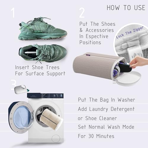【Dual-Compartment Design – No More Rubbing & Scuffing】- HugList Shoe Washing Machine Bag features dual compartments that secure each shoe separately, preventing rubbing and scuffing. Unlike overstuffed single bags or loose one-shoe bags, this design ensures superior cleaning, better balance, and enhanced protection.【Plush Chenille Fiber – Clean & Protect from Every Angle】- velvety chenille bristles provide 360° cushioning for a deep yet delicate clean. Tough on dirt, gentle on shoes, it reduces noise and protects both footwear & washing machine. Ideal for sneakers, gym shoes & everyday footwear, ensuring a safer wash every time.【Adjustable Shoe Trees – Maintain Shape & Enhance Cleaning】- Keeps shoes in shape during washing, preventing collapse for better cleaning. Mimics hand-supported scrubbing to maximize chenille fiber contact. This ensures a thorough clean, while preserving your footwear’s structure—no more squished or misshapen shoes!【Mesh Insole Slot – No More Loose Pieces】- A dedicated mesh slot holds insoles & laces securely, preventing them from floating, curling, or getting lost. After washing, everything stays together, so you won’t have to dig through laundry—perfect for washing multiple pairs at once & keeping things organized.【Reinforced Hidden Zipper – No More Scratching or Snagging】- Inside-out zipper design with a wide cover shields shoes, washing machine, and clothes from scratches, snags & stress. Unlike side zippers, our top-lid opening reduces wear and extends durability, ensuring a secure wash cycle with no accidental openings.【Multipurpose – Wash, Store & Travel】- Beyond washing shoes, this versatile laundry bag is perfect for pet owners, offering a hassle-free way to clean harnesses, collars, leashes & toys. Ideal for laundromats, travel & seasonal storage. Durable, breathable fabric prevents odor buildup & scuffs. Perfect for everyday use. superior materials and excellent craftsmanship ensure long-lasting durability.