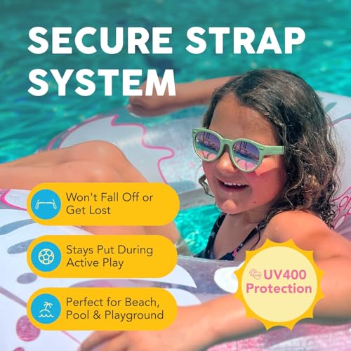 • SECURE STRAP SYSTEM FOR ACTIVE BABIES - Adjustable silicone head strap and ear adjusters keep sunglasses in place during play, beach trips, and outdoor adventures.