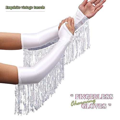 Women's Sparkly Sequin Fingerless Elbow Length Satin Fringe Gloves for Prom Party