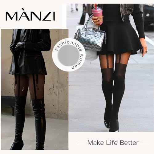 MANZI Mock Suspender Pantyhose for Women Faux Thigh High Stockings Black Over the Knee Goth Sparkly Tights