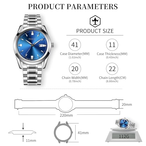 Item width: 41 millimetersClasp type: Foldover ClaspItem type name: Dress Watch【Classic Luxury Men Watch】Taxau classic luxury silver-blue watch is made of upgraded premium 316L stainless steel case and bracelet, meticulously ground and polished to resist tarnish, ensuring this fashionable blue men’s watches with luminous pointers & scales remains a timeless symbol of refinement for years.【Waterproof Watches for Men】30-meter water resistance withstands hand washing, rain, splashes, offering real peace of mind for life spontaneously. Taxau waterproof analog watches look good with both dress and casual wear, perfect for party, business working, traveling, dating or others activities.【Scratch-resistance Stainless Steel Watches】Enjoy crystal-clear timekeeping protected by premium hardened mineral glass. Engineered to be significantly more scratch-resistant than standard glass, This stainless steel watches for men with date maintains a flawless view of the sleek minimalist dial through daily adventures.【Comfort to Wear】Powered by reliable original quartz movement, Taxau watches for men delivers unwavering accuracy. Paired with a secure, adjustable stainless steel bracelet featuring a reinforced convenient clasp, mens watches large face offer exceptional comfort that transitions effortlessly from office to evening.【Watch Size】The face of the dress watches for men is 1.61 inch (41mm), 0.43 inch (11mm) in thickness, 0.78 inch (20mm) in bracelet width and 8.66 inch (220mm) in bracelet length. Each watch arrives in a exquisite gift box, making it an ideal gift for father, husband, him on Father's Day, Valentine's Day, Christmas and birthdays. Perfect for everyday use. finest materials and excellent craftsmanship ensure long-lasting durability.