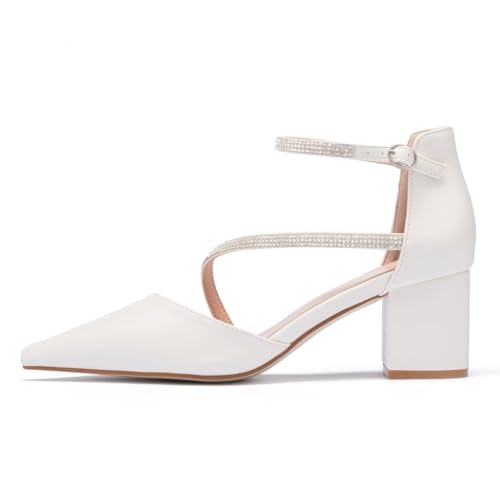 Frank Mully Women's Heel Pumps Close Toe Heels Low Block Chunky Pumps Shoes with Ankle Straps Wedding Party Dress Shoes Rhinestone