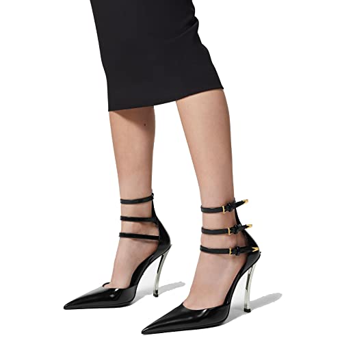 THESHY Womens Ankle Strap Metal Stiletto High Heel Pointy Pumps Buckle Up Fashion Dress Party Pumps