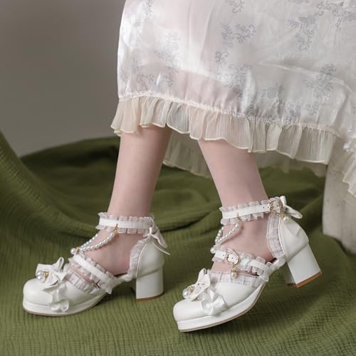 Parisuit Womens Kawaii Lolita Pearl Bow Shoes Mary Jane Cute Platform Heels Chunky Heel Ankle Strap Pumps