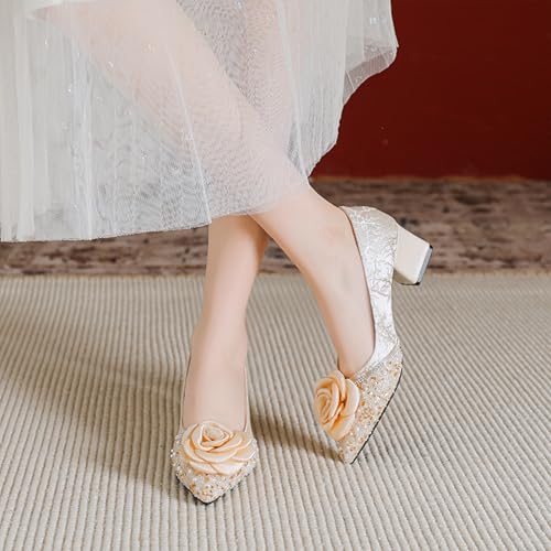 Women's Satin Flowers Rhinestones Chunky Heel Pumps Fashion Grace Slip On Lightweight Mid Block Heel Dress Pumps Shoes for Leisure Wedding Party Prom