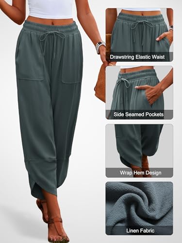 Fabric type: 70% Viscose, 30% LinenCare instructions: Machine WashOrigin: ImportedClosure type: DrawstringMaterial: Lightweight summer linen pants for women, casual style, relaxed slouchy fit, comfy to wearFeatures: Cropped capri pants, side seamed pockets, wrap design at hem, solid color, drawstring elastic waist , baggy wide legStyle: This cozy womens beach pants is featured in a slouchy, pull-on silhouette with curved hem detailing and smocked waistband, wide leg trousers are easy to style, you can pair these with a tank and crop tops or style them with sandals as a beach coverup. Let you enjoy relaxing and pleasant in summerOccasions: The women's loose wide leg palazzo pants ideal for any casual occasion, such as streetwear, daily wear, work, yoga, going out, shopping, travel, vacation or beachWashing: Machine washable, hand washes cold, dry flat in shade. Do not bleach Perfect for everyday use. finest materials and excellent craftsmanship ensure long-lasting durability.