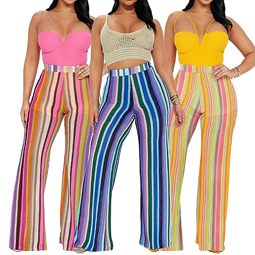 Women's Striped Knitted Crochet Wide Leg Pants High Waist Straight Leg Palazzo Pants