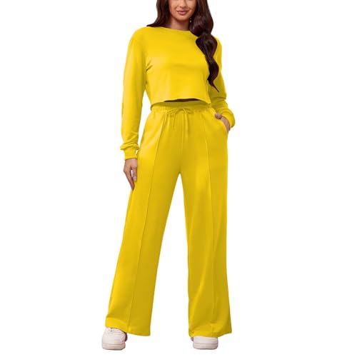 PINSV Women's 2 Piece Outfits Sweatsuit Set Long Sleeve Crop Top Drawstring Wide Leg Pants with Pockets Tracksuits Casual Set